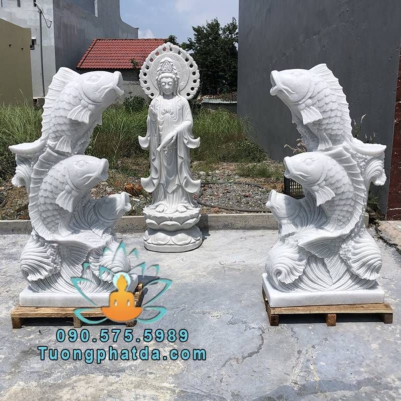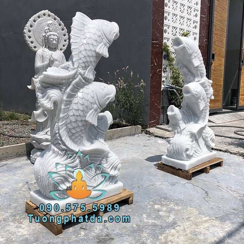 - Mẫu tượng cá chép phun nước đá cẩm thạch trắng đẹp , kích thước cao 1.2m một tượng. Được chế tác từ chất liệu đá cẩm thạch nguyên khối 100%. Hệ thống nước được khoan âm trong tượng cá. Tùy biến vị trí cấp nước theo mọi nhu cầu của khách hàng.